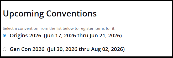When you have created/confirmed an account with our updated site, the Overview page will have a toggle between our two current shows – Origins and Gen Con.